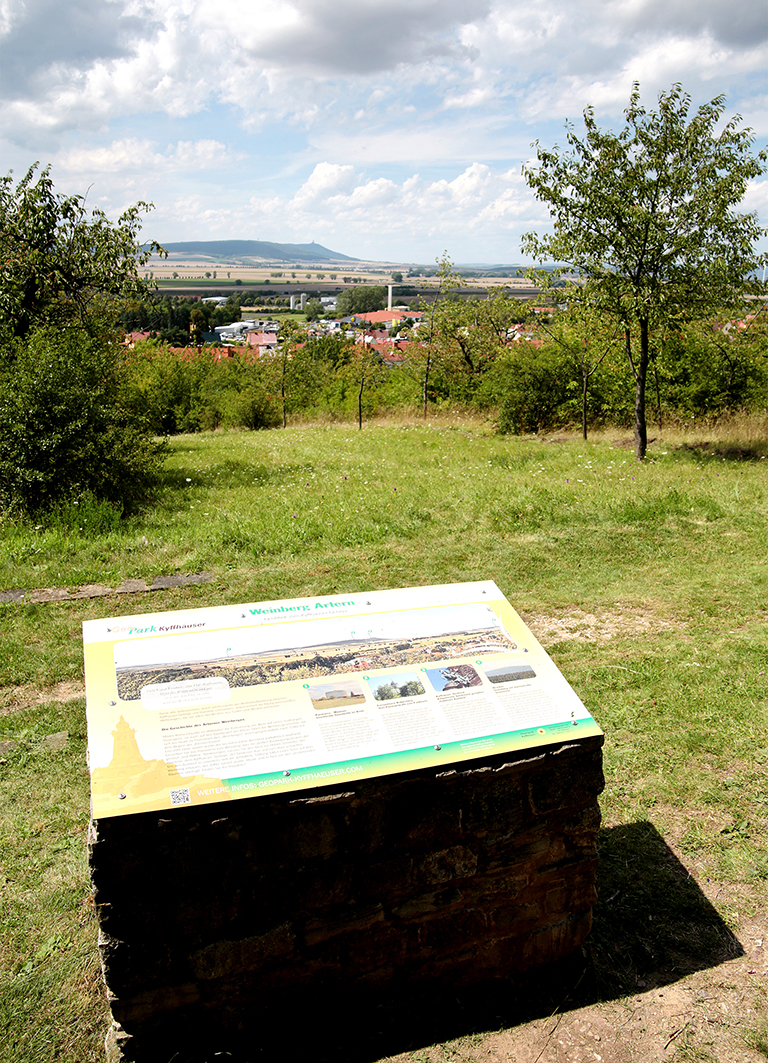 Artern liegt an der Unstrut, eingebettet zwischen den Ausläufern des Harzvorlandes, des Kyffhäusergebirges und der Hohen Schrecke. Der Ort am Rande der goldenen Aue gehört klimatisch zu den wärmsten und trockensten Gebieten Deutschlands. Auf den Wiesen am Hange des Weinbergs, mit Blick zum Kyffhäuser, kann man das Knabenkraut (eine wilde Orchideenart) bewundern.
